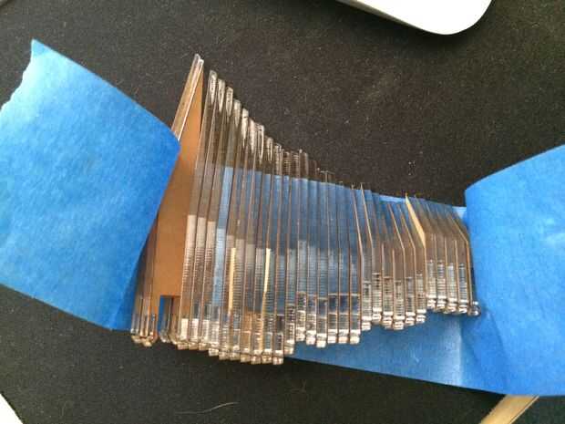 Las paletas son donde pasó la mayor parte de la innovación, el diseño y el esfuerzo. La altura de las paletas varía desde la parte posterior al frente de una función de onda de seno. Ellos son en ángulo para que la superficie interna interna refleja la luz proveniente de la NeoPixel. He tenido algunos otros diseños que parecía inteligentes pero resultaron para no ser de mi agrado ya que la mayoría de la luz irradia hacia el exterior. La parte inferior de las paletas con ángulos y ranuras de corte para que encajen en los anillos. Un truco que aprendí del blog de Ponoko es que ángulos, cortados de acrílico realmente radios muy pequeños para evitar que el acrílico se fisure. He vivido cerca de 20-30% fracaso sin la característica. El archivo DXF incluye esa característica y no he tenido una rotura después incluí la técnica.
