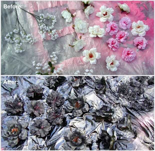 Retire las flores y las hojas de los tallos.  Extiéndalas en una lona y rociar pintura negra.  Está bien si algunos del color original muestra a través de... añade a la escalofriante y dar las flores un poco más de profundidad.  (Guardar los tallos para más tarde... que voy utilizando para hacer la forma de guirnalda.)