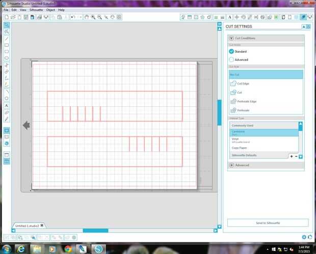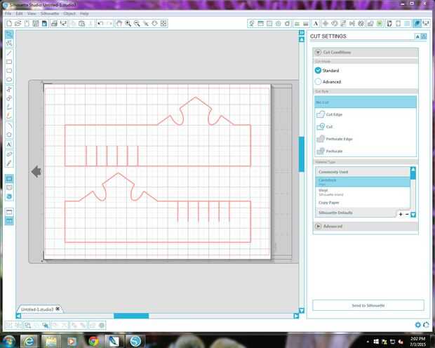 En el software de estudio de la silueta, empecé con el rectángulo de 2 "x 9" otra vez. Dibujaba una línea de las pestañas y luego replicarlos 5 veces, 1/2" aparte. Las pestañas hará que sea ajustable. Si no los incluye, la corona puede ser pegada en la parte posterior y un tamaño cabe todos.