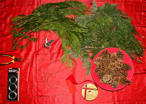 Recoger piñas, ramas de cedro y ramas de pino o abeto de afuera y salvar un número de viejas, perchas de alambre llano que no desea utilizar para la ropa ya.