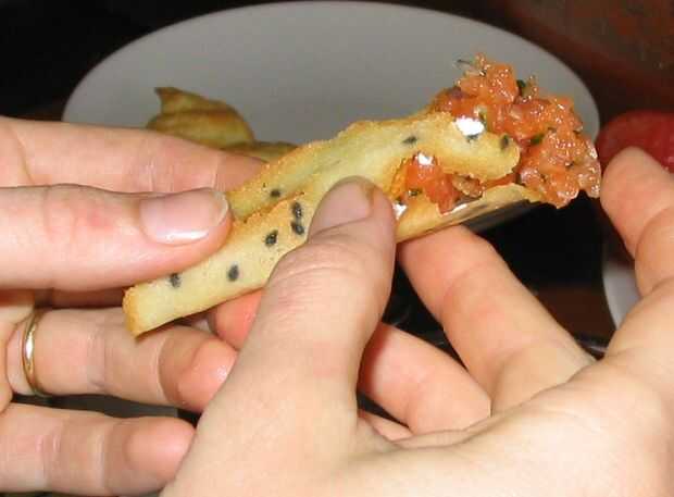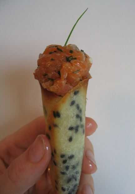 De cualquier manera, eran increíblemente sabrosas. Si hago esto otra vez, probablemente sería saltar los conos y sólo plop el coronet semicocido rondas en moldes de mini-muffin para hacer cáscaras no agujereado para sostener mis ingredientes. Yo probablemente sería sustituir una mezcla de queso crema con crema agria o yogur de nata fresca, ya que es mucho más barato y proporciona principalmente una papel grasosa para el salmón. Podría hacerse grasa si te preocupas por estas cosas.