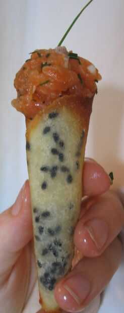 En primer lugar, sacar un poco de nata fresca en la parte superior de la corona. Tubería con una manga pastelera para puntos de bonificación. Al parecer si se prepara correctamente, será lo suficientemente espesa para pegarse en la parte superior del cono; mina decidió ser muy líquida para que funcione. Por lo tanto, el truco de cono horizontal: vierte la nata fresca, entonces mantenerse tan cerca como sea posible añadiendo el salmón y servido sobre un plato.