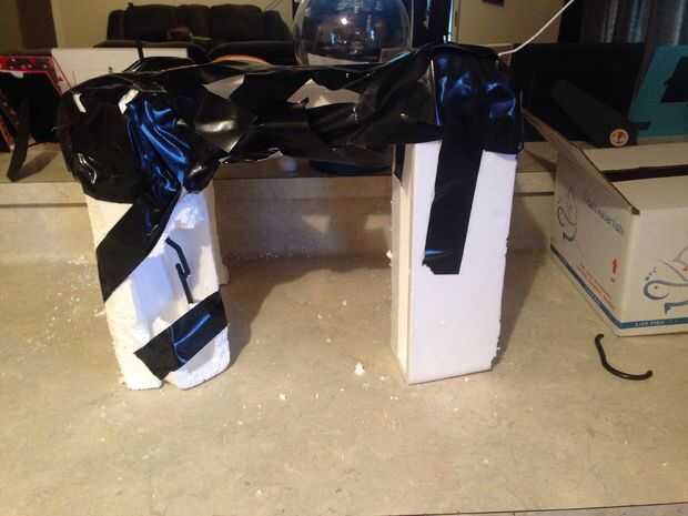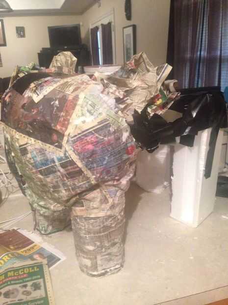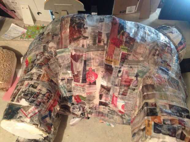 Este paso es bastante fácil, encontrar una base para que los "huesos" de este modelo, he encontrado algunos espuma de poliestireno de una computadora en mi trabajo de maridos, ahora ponga los pedazos juntos, piernas y núcleo, utilizar cantidades locas de cinta... Loco. Ahora que tiene un esqueleto set, haz una división de suspensión de cable en 4 pedazos y ponerlos dentro de la espuma para hacer la forma de los bordes más fuertes, alrededor de las piernas y más fuerte. Inicio desmoronando viejo periódico, directorios telefónicos viejos, cinta hacia abajo para crear una parte posterior a su elefante, no te preocupes demasiado por la perfección se trata básicamente cuando el relleno encima de tu elefante, Inicio agregar las capas de papel maché, algunas personas utiliza pinceles, pero me gusta el desorden... Hice las tiras en la mezcla y poner em en el formulario, ahora recuerdo, cada capa debe estar seco antes de agregar un 2 a 3 rd o un 4 th, en este punto que probablemente todavía parece cobarde, y que está bien, ahora su forma en el vientre de elefantes, lados y parte superior de trabajo, hace agradable y completo, deje que se seque completamente.