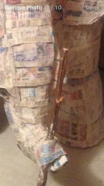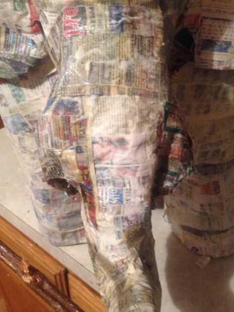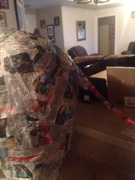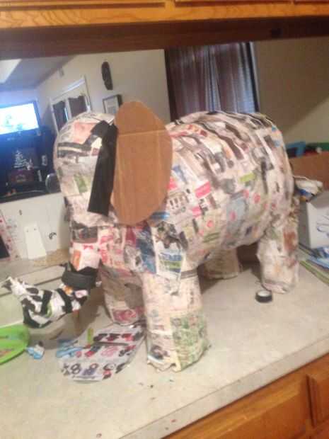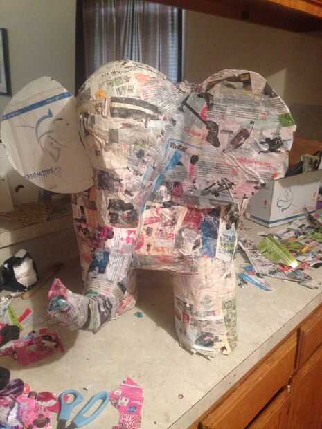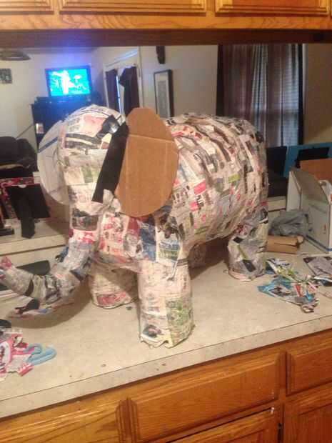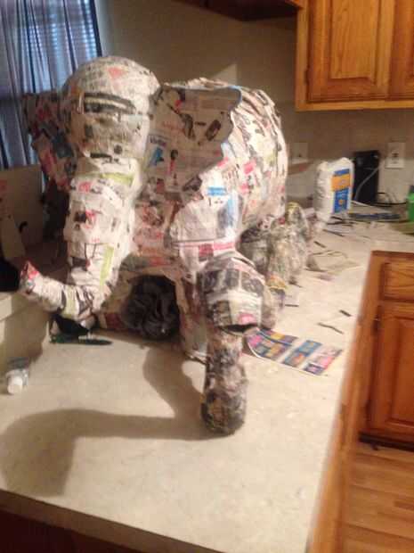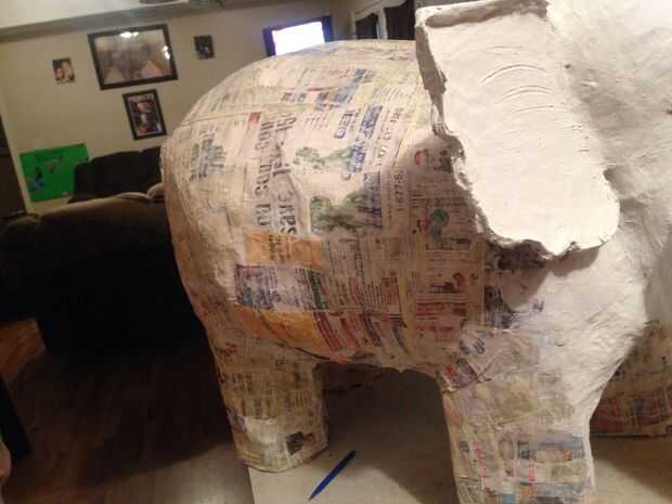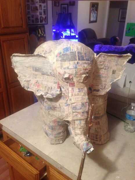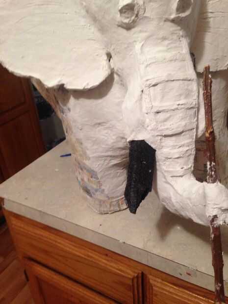 Después de que la cabeza se ha adherido a la forma muy que bien hice las orejas, ahora esto es complicado... Los elefantes indios tienen orejas más pequeñas, claramente nunca noté hasta que mi hijo de 3 años lo me indicó... Así que corta las orejas para tamaño, cinta adhesiva la cartulina hacia abajo y empezar a aplicar el papel maché de gira en a los oídos y la cabeza, una vez que estén en allí bastante bien, centran su atención en el tronco, aquí utilicé 1 gancho de alambre y une a la pequeña bola / cabeza cosa, empezar formando un tronco largo, tenga en cuenta cómo quieres colocar , comenzar a añadir la capa de papel maché 1 a la vez, no tengas miedo, mantener cachondeo con él hasta que parece un tronco, ahora uso su 2 gancho de alambre y lay recto, guárdalo para atrás todo el camino, cinta hacia abajo y te cuelguen hacia abajo para formar la cola, cortado a la medida. Y otra vez añadir más papel maché tiras, asegúrese de prestar atención a los detalles de los elefantes hacia atrás, la cola era larga atiende para cortar y otra vez se había cubierto de papel maché 24-36 horas más tarde, comprobar que en él hacen que se seque totalmente antes de agregar más sobre ella. Entonces hice una escalera por así decirlo en el tronco para crear profundidad y detalle, no es un buen momento para actuar el palillo coronel Haithi lleva con él para conducir su brigada, fui fuera consiguió un palo roto de la tierra, de uno de nuestros árboles, añadir papel maché alrededor de ella para asegurarla. Ahora las hojas que hice de fieltro extra de un proyecto de dinosaurio pasado hice color verde, cortar 2 hojas de allí doblado a la mitad en recortes poco hechos todos alrededor para crear movimiento, se adhieren y ahora esperar hasta que todo se seca, después de cubrirlo con una capa de arcilla de papel sólo agregar 1 taza más de compuesto a