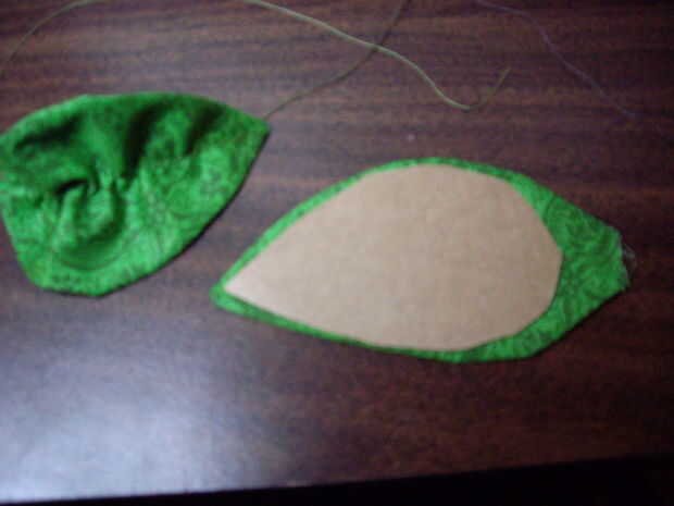 Una vez que la hoja ha sido presionada reunir la vena del centro, comenzando en el centro de la espalda. Con una puntada larga hilvanada comienzan con tres puntos, tres puntadas hacia atrás, luego adelante a dentro de aproximadamente un 8 de una pulgada desde el punto de la hoja. Tire del hilo de la canilla para recoger la hoja, ajuste hasta que se parece a una hoja. El reunir hará que la hoja de rizar un poco. Tire del hilo superior en la parte inferior y atar los hilos de rosca para mantener seguros los se reúnen. Clip de rosca. Acabado de la parte posterior de la hoja con una puntada de zig-zag. Repita para todas las tres hojas o hasta que tenga tantas hojas como desee.
