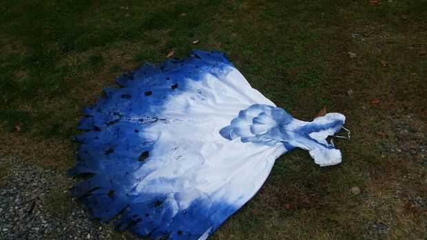 después cortan hasta luego tomaron algunos pintura en aerosol azul y desapareció en los bordes. Sugiero ser muy paciente con la parte, si usted precipita obtendrá líneas y spray extra en lugares u no quiero rociado. Luego usé un negro en las puntas muy añadirle una oscuridad. pero luego se agotó. lol. el arco es probablemente mi favorito para hacer. Me gustó mucho esa parte, bloquear cada capa y roció a los extremos. también rociar los bordes de los encajes de todo vestido a color.