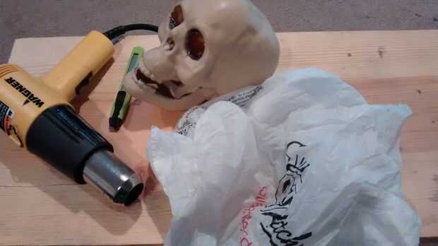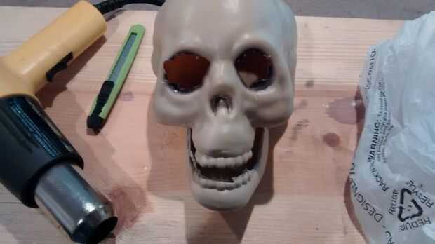 tengo una calavera de mi tienda de dólar de la zona. Muy básicos, plástico y cursi! Una bolsa de plástico y pintura o tinta para madera.