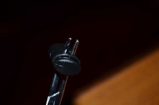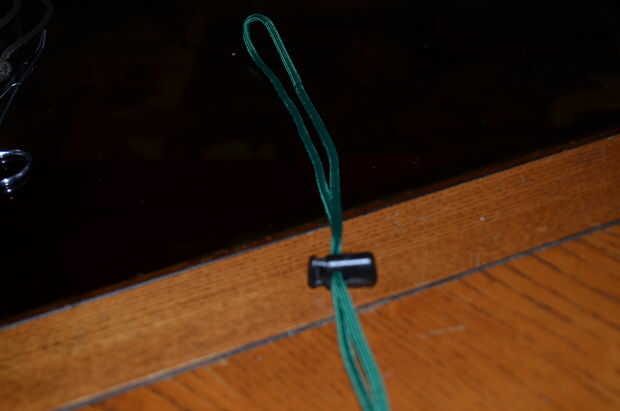 Ajustar la nooses(?) para que sean aproximadamente del mismo tamaño y luego doblar la cuerda por la mitad. Poner tus pinzas hemostáticas por el agujero de la cerradura de la cuerda y abrir sólo ancho suficiente para que paracord caben en ellos. Ahora ponga el paracord en las pinzas hemostáticas y tirar por el agujero de la cerradura de la cuerda. Ahora debe tener un lazo en un lado de la cerradura de la cuerda y dos nooses(?) en el otro lado.