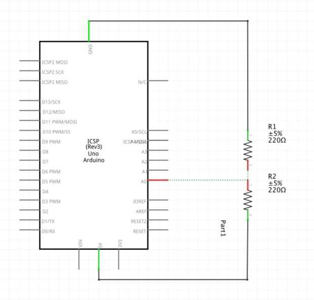 Vamos a utilizar una tensión simple circuito de dividir para poder usar la variable resistencia del cable elástico como un sensor de respiración. Si desea saber más sobre División de circuitos de tensión, es básicamente unas resistencias en serie que se convierten un voltaje grande en uno más pequeño. Dependiendo de los valores de las resistencias que se utiliza, puede cortar su 5V hacia fuera de tu Arduino en porciones más grandes o más pequeñas de sí mismo con un resistor de pull-down, que es útil para la lectura analógica. Si desea más información acerca de las matemáticas detrás de voltaje dividir circuitos, echa un vistazo al excelente tutorial en Sparkfun.