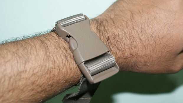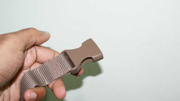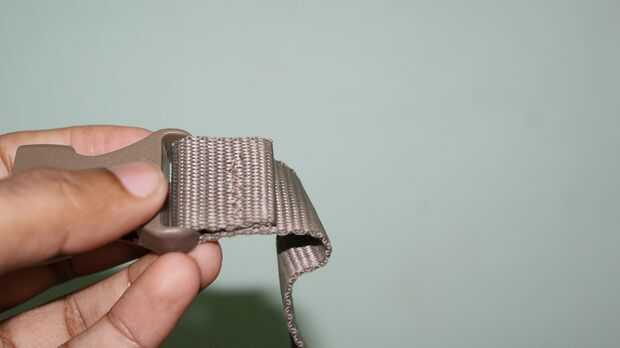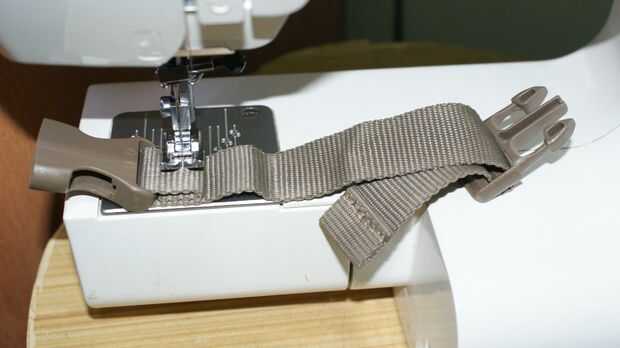 Ahora usted puede coser la correa a la hebilla. El otro extremo está asegurado ya como se ve en la foto. Puede coser con una máquina de coser o usted puede incluso mano-puntada.