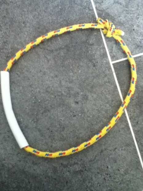 Esto es muy simple - sólo pase la cuerda a través del tubo y haga un nudo. He utilizado un nudo de arrecife.