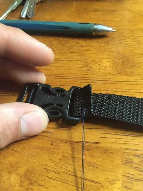 decidir sobre la longitud que necesita y corta correa... Recuerde que quemar los extremos para evitar que se deshilache. En este ejemplo estoy usando 1/2 '' ancho correa con una hebilla de 1/2 ''. La hebilla debe ser el tamaño correcto de la correa asegurar que ajusta correctamente y encaje en su lugar. En el lado hembra de la hebilla cose la cinta juntos formando un extremo de la correa de la hebilla. He utilizado un básico sobre/bajo el estilo de costura de costura, pero usted puede reforzar la costura por Cruz eclosión su patrón de costura.