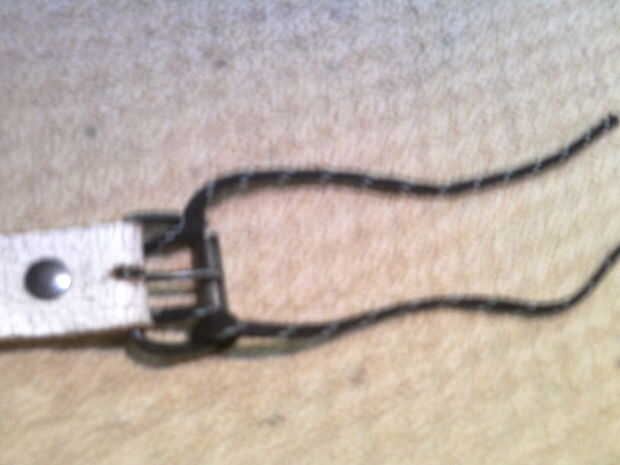 Hacer esto tomar su pedazo de cordón / cordón y cortar así su unos 20cm, dóblalo por la mitad y colócala en el orificio hecho en el cinturón de nudo alrededor de la cerradura de la correa a la longitud que usted está más cómodo jugando en el.