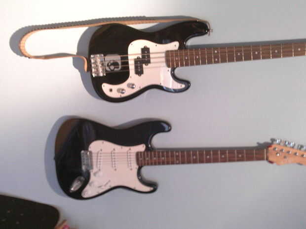 Mi novio tiene muchas guitarras, pero hasta hace poco, sin correas.Este es el prototipo de lo que una correa de guitarra sin necesidad de utilizar fijaciones de una correa previamente comprada (que encontrado común entre otras correas de guitarra DIY