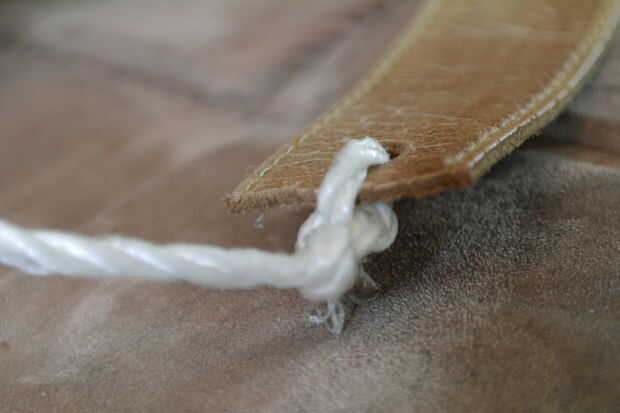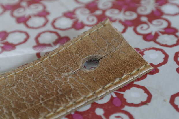 Así que corté la correa sobre el lugar donde estaban los agujeros, e hice un hoyo que podría caber en esa cosa para poner las correas.