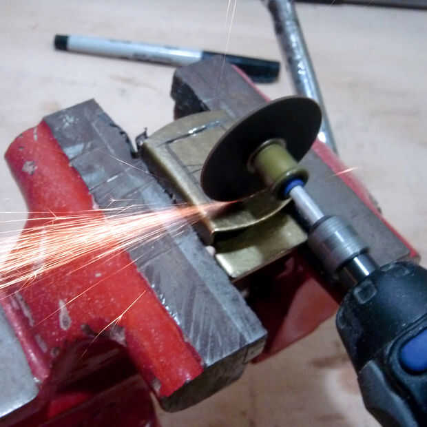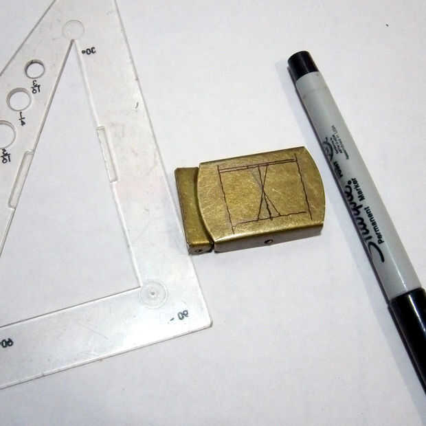 Usando una rueda de corte de metal en una herramienta giratoria la hebilla cara fue cortada a lo largo de las líneas del boceto, luego se alisaron los filos de corte.