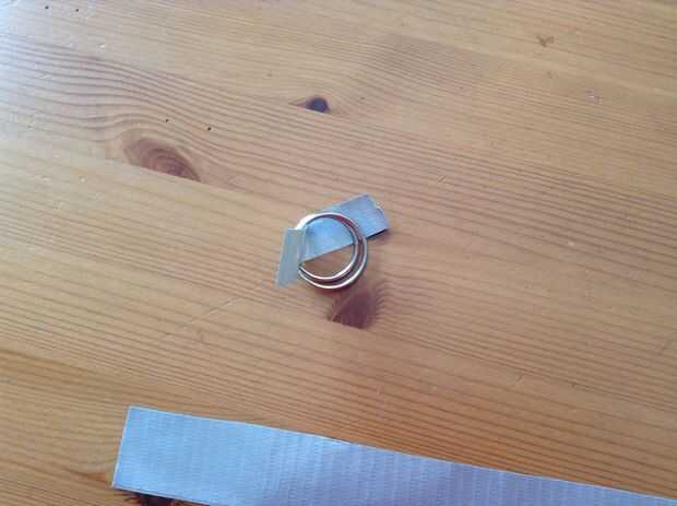 Tomar los llaveros y poner un trozo pequeño de cinta a través de ambos anillos.