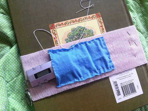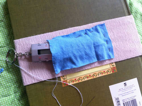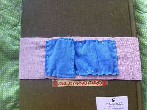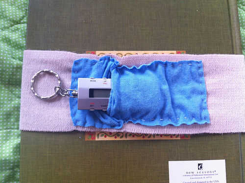 Terminar un lado corto de cada pieza de tela. A partir de la pieza más grande, coser los tres bordes restantes a la correa, asegúrese de estirar a la tela con la correa. Comprobar colocación deslizando la alarma en el bolsillo, asegurándose de que cabe aún sin ser demasiado apretado o flojo.