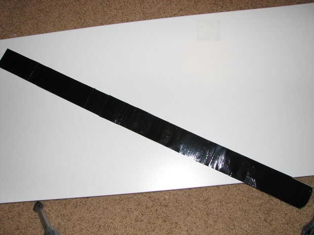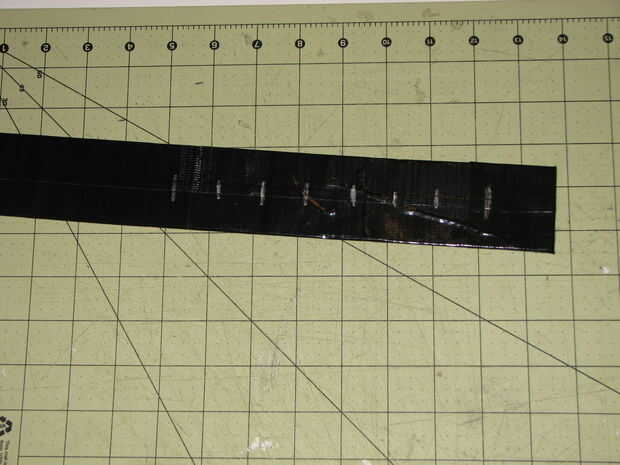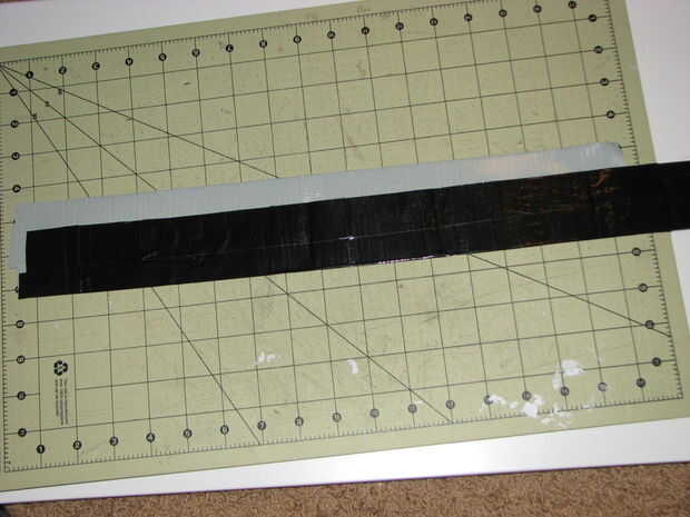 Ahora vamos a hacer la correa gruesa. Éste es dos veces la anchura de la correa fina primera (será el mismo ancho que la cinta) y unos 25" de largo. Cortar dos tiras de cinta adhesiva alrededor de 13" de largo y ponerlos juntos lado adhesivo en. Tenga cuidado al ir. cinta del conducto como a palillo cuando y donde no. Como usted con la correa fina, hacer dos de estos, luego con cinta adhesiva al igual que hizo la correa delgada.