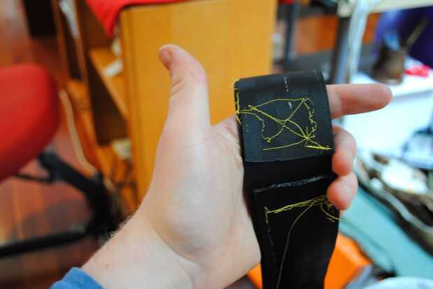 Entonces quieres tomar el otro extremo de la tela del cinturón de seguridad, enlacen y coserlo. Se trata de la manija del gancho