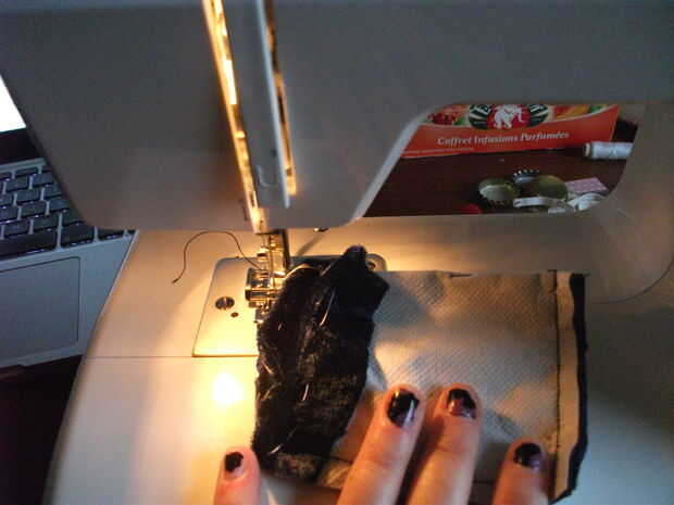 Tiempo de máquina de coser! Ahora, coser las capas juntas (usted puede también hacerlo a mano, si es necesario). Usted necesitará una aguja fuerte porque la pieza impermeable es muy difícil y se puede romper. Han cosido lo, una vez todo lo fuera. Ta da! El trabajo está casi listo!