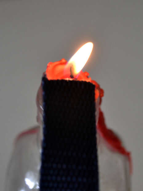 Como se puede ver en la imagen del paso de materiales, la cinta de nylon ha comenzado a desarmar. Y cuando se corta este tipo de correas se encuentra después de manipular un poco los extremos hará esto. Aquí es donde entra la vela en su lugar. Como la correa se hace de un material termoplástico se funde por el calor y set cuando enfríe, por lo que usar la vela para calentar para arriba los extremos, lo suficiente como para derretir un poco del final. Trate de no ponerla encima de la llama, pero a un lado para no encenderse.