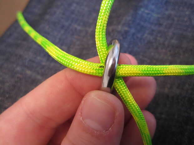 Empezar manteniendo la presión en un lado y tomar tus dos trozos de cable, pasando por el ojo del snap, tratar de conseguir el cierre como cerca del centro de las dos piezas como sea posible. Dejando aproximadamente la mitad de cada pieza a cada lado del snap. Puede hacer una marca para saber dónde está el centro. Ahora hacer una forma de "X" con dos cuerdas.