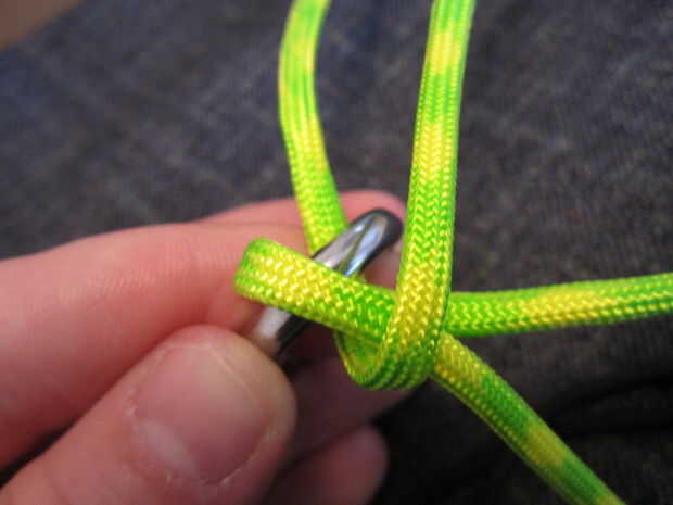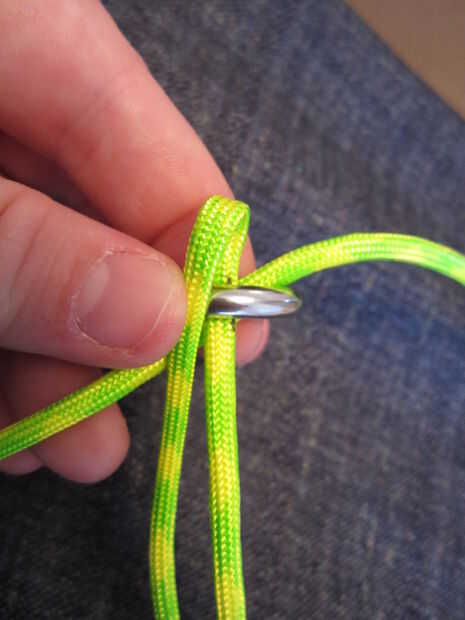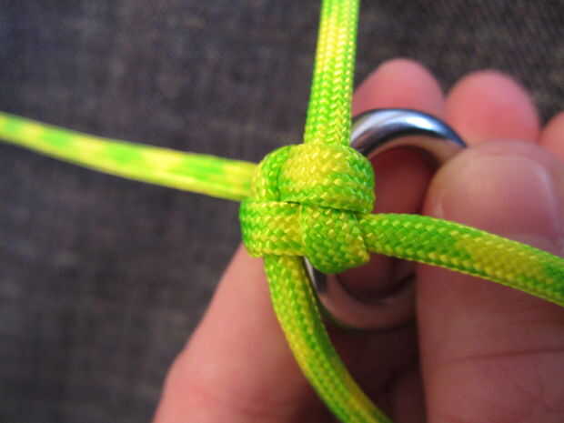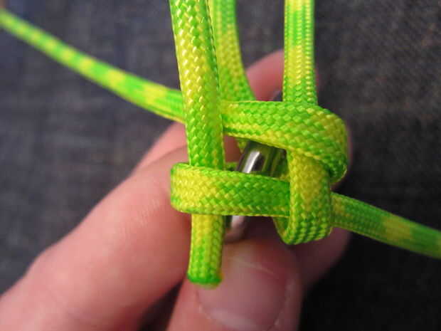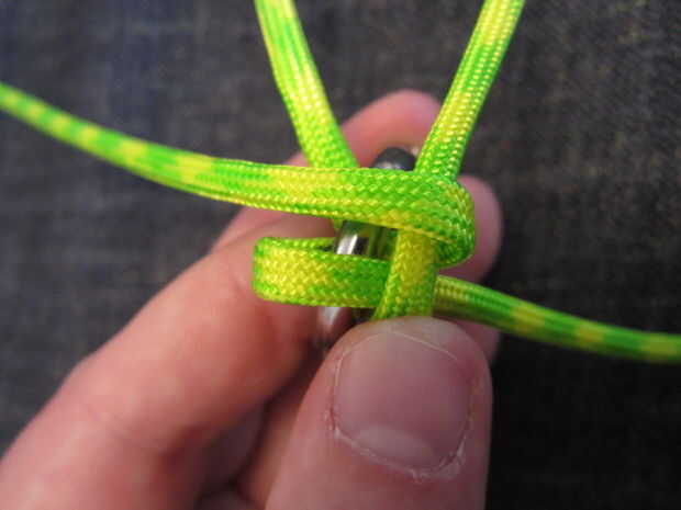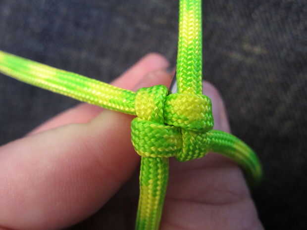 Ahora tome el pedazo izquierdo superior y doble hacia abajo sobre la otra pieza de la izquierda. Continúe haciendo esto hasta llegar a la cuarta pieza. Va el reloj contrario sabio o inicio solo del reloj en el lado derecho. Ahora la cuarta pieza y meta a través del lazo de la primera pieza y tire todas las piezas lo mas ajustado posible. Quiera conseguir alguna ayuda o conseguir dos de las piezas que están frente a la unos a otros, así que usted puede conseguir muy apretado. Ahora repita va izquierda, derecha, izquierda, derecha, o hacia la derecha, izquierda, derecha, izquierda dependiendo de cómo comenzó, hasta llegar cerca de 10 a 12 pulgadas desde el extremo.