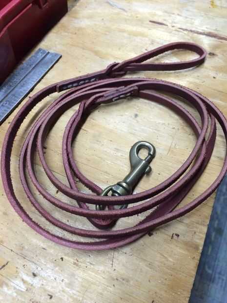 Recientemente recibimos un nuevo perro en la casa. Nos compramos para una segunda correa de cuero en el Petco pero no tienen. Cuando lo vi, cuero de amarre en la tienda de tachuela, pensé que haría uno. $4 dólares en cuero y $.99 para el snap y a unos 15 minutos.