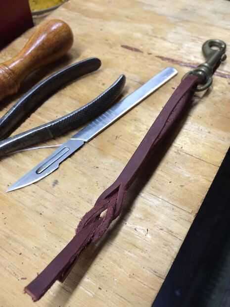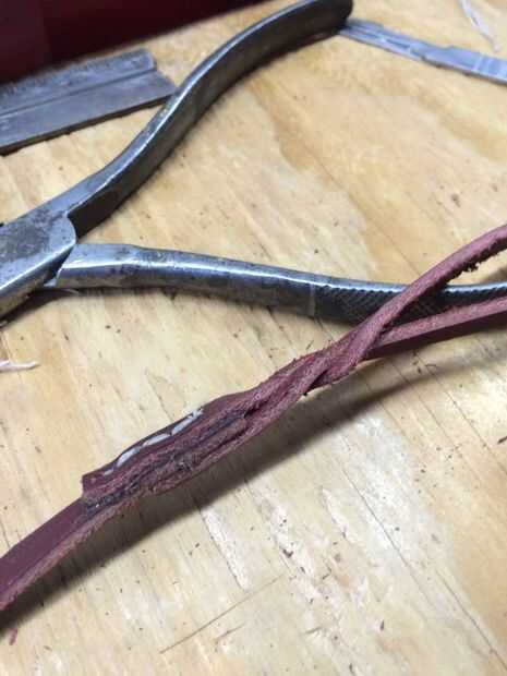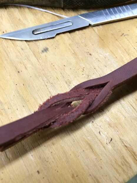 Porque el pedazo de cuero que tenía era solo de 6 pies, quería que la correa sea un poco más. Había doblado sobre el extremo de la manija y luego la cosió a sí mismo. En el extremo del broche de presión, cortar sobre una tira de 8 pulgadas de una segunda correa había doblado encima en sí mismo, corte las ranuras de 1 pulgada del extremo, luego pegado y había cosido al resto de la correa.