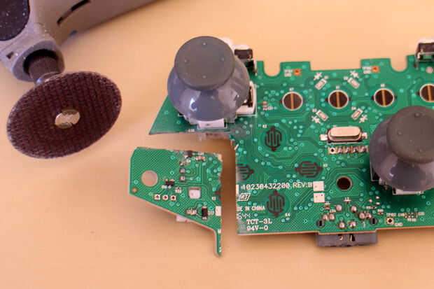 Las bolsas encajan casi el controlador, pero el tablero de regulador tendría que ser modificado para acomodar las bolsas. Usando una herramienta giratoria con un disco de corte una porción de la tarjeta controladora se ha eliminado.