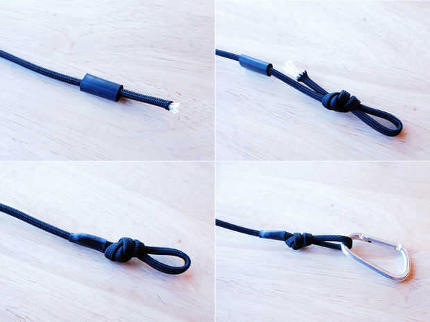 En el otro extremo de la paracord una pequeña porción de calor retráctil fue rosca tubo, luego el extremo de la cuerda estaba atado en un nudo para formar un bucle. El encogimiento del calor se coloca en la cola del extremo anudado y asegurado en su lugar con una pistola de aire caliente o soldador.