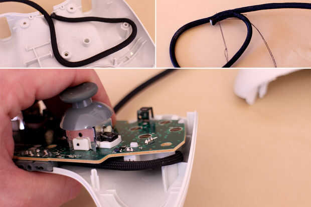 Para colocar el paracord correa al controlador un lazo fue cosido en un extremo de la paracord. El lazo entonces fue envuelto alrededor de los puntos de conexión para las dos mitades del controlador. Cuando el controlador está vuelto a montar y atornillado, este bucle se envuelve firmemente dentro del controlador.