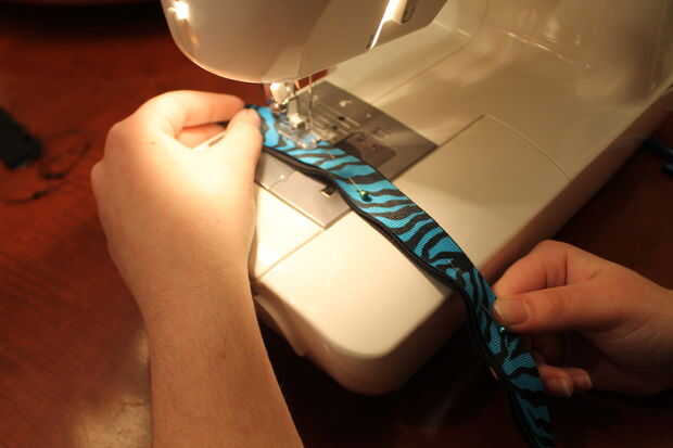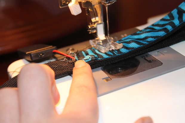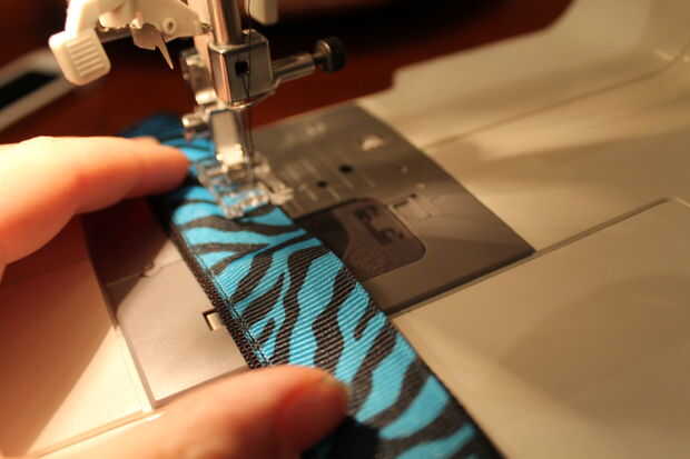 Usando una máquina de coser, coser todo junto. Comenzar cosiendo hacia abajo los lados de la cinta en la parte superior sus correas de nylon. Tienes que coser como cerca del borde de la cinta de opciones como sea posible para que accidentalmente no cose en un LED o un resistor.