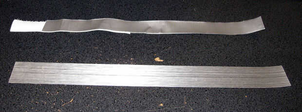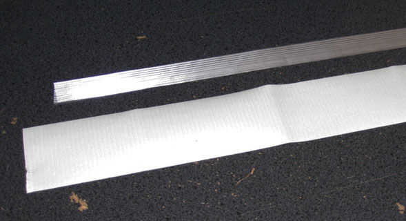 Ahora, si usted quiere su correa para ser agradable y duradero, te sugiero usar... Cinta de flejado. Je je... De todos modos, fleje cinta es genial, si un poco caro (como $7 un rollo). Pero si ya tienes algunos, a hacer una buena base para envolver cinta alrededor. Corte mi tira por la mitad y pegadas las 2 mitades. Todo lo que necesitas hacer es hacer una pequeña muesca al final, luego corte a lo largo.
