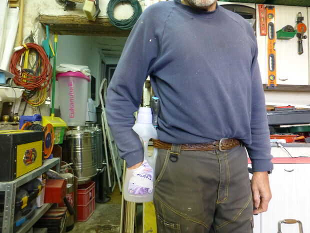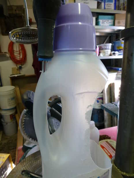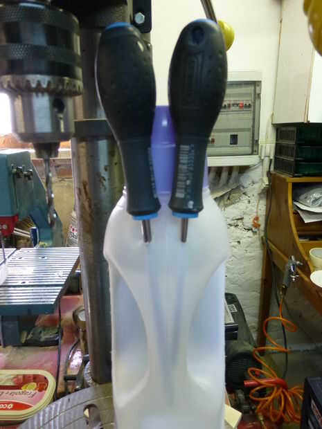 Los tornillos van en la base y uno o dos destornilladores entran en los agujeros en la parte superior y el proyecto en el mango para mantenerlos constantes. Incluso podría atar las manijas a la manija de la botella si está trabajando en un área donde usted no quiere caer en una pocilga, por ejemplo.