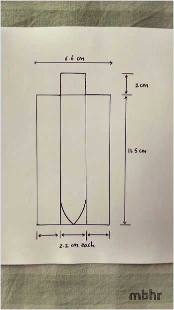 Básicamente, la anchura del rectángulo debe ser 3 veces la anchura de la correa, y su longitud debe incluir la punta de la correa. Además, hay una pequeña pestaña en la parte superior, que se pliega en.