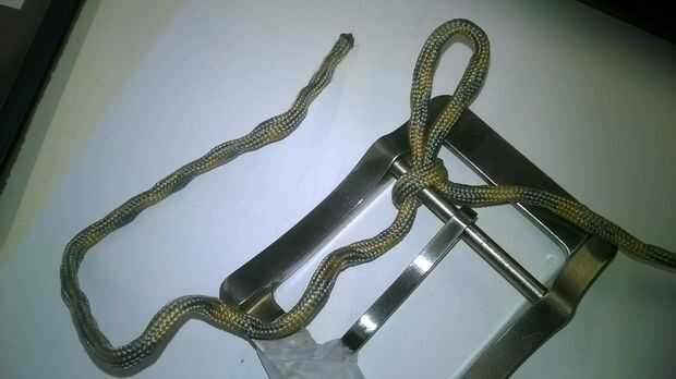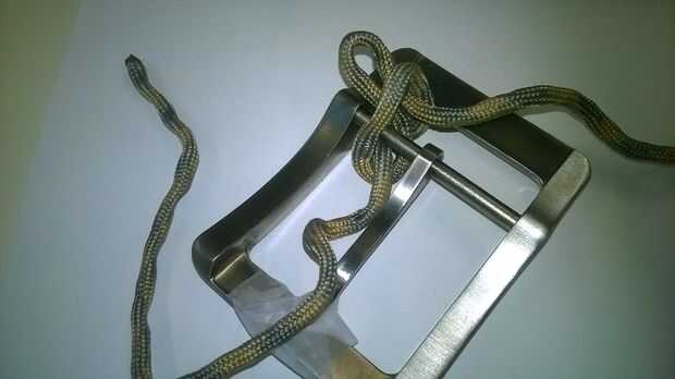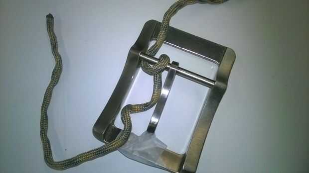 Hacer sólo una vuelta alrededor de la hebilla, como shon en la primera foto, por lo que tiene un pies de paracord como corto, parte de la derecha (la pieza en la parte inferior izquierda de la foto era un poco demasiado corta cuando se toma la foto, así que tuve que rehacerlo más adelante en el proceso) y el resto como trabajo fin (en la parte superior derecha en la foto). Paso luego un lazo al final del trabajo a través de esta primera vuelta y apretar (como se muestra en las fotos dos y tres).