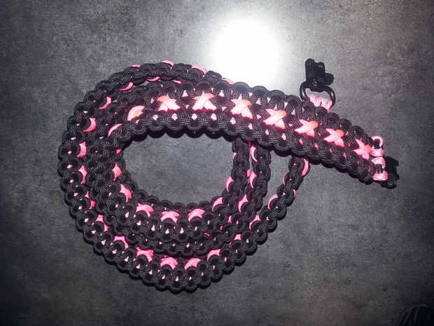 se trata de una correa de perro de 4 pies ish pararcord. se extiende algunos así que si quieres un rígido que le dirá cómo un poco más adelante. Esto también tiene varios colores que no muestro cómo conectar distintas hebras. Recomiendo usar un color