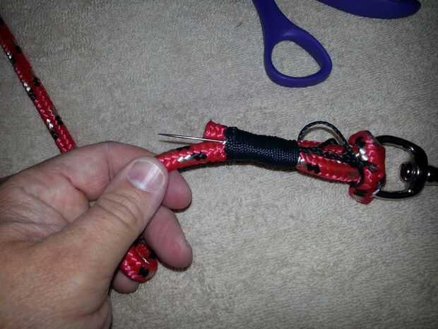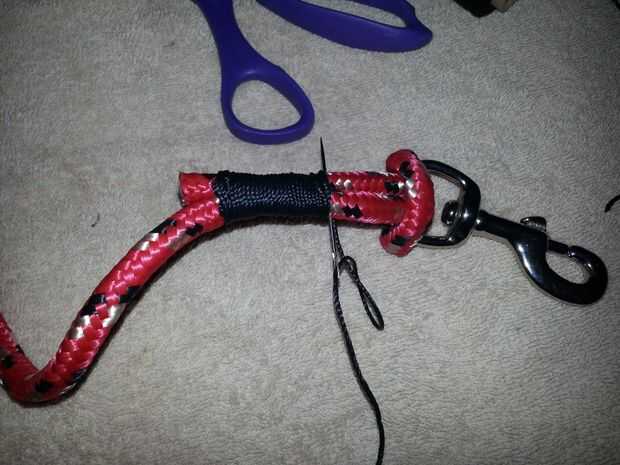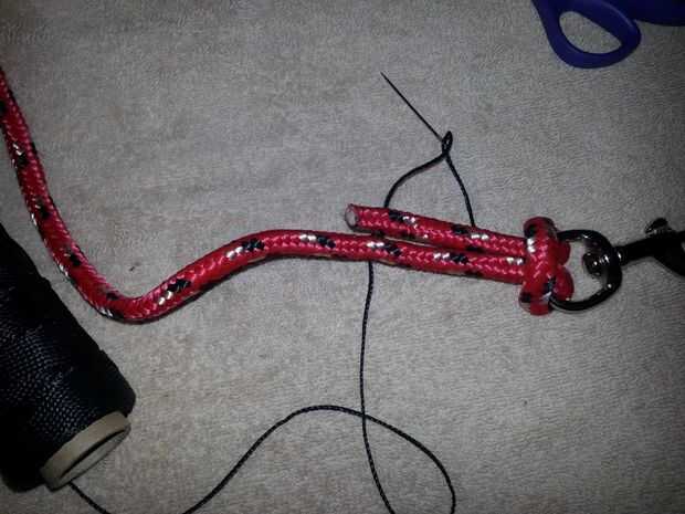 Carrete de unos 5 pies de cuerda y enhébrelo en la aguja. Comenzar cosiendo a través de la línea y al final perder y atar apagado. Esto mantendrá los juntos mientras trabajas. (Esto es donde me di cuenta que necesitaba los alicates de punta para tirar de la aguja a través de la cuerda).