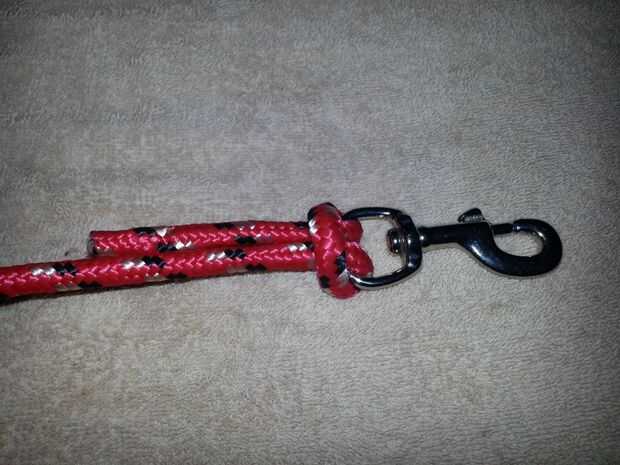 Comience con un nudo de enganche de cabeza/acollador alondra muy sencilla (también conocido como un "Enganche de vaca" o "reversa doble enganche de medio") unir la cuerda al clip giratorio. Asegúrese de que tener unos 6" de línea libre de sobra.