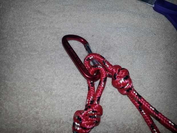 Cuando los lazos son todos tomados, la carga es todo en los nudos de dos extremos y el mosquetón. El resto de los nudos es todos a colgar los ganchos de mosquetón.