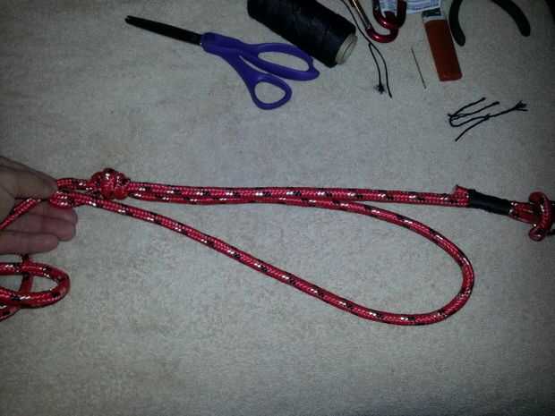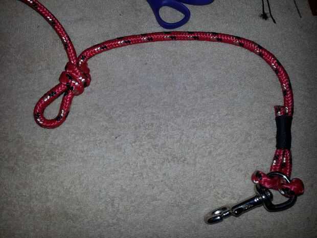 Sube aproximadamente 18" del clip y haga un nudo de lazo muy simple. He utilizado un bucle básico por todo lo alto. Asegúrese de que este bucle es lo suficientemente grande para poner fácilmente clip mosquetón en y fuera del cómo se acorta la correa. También se trata de mi punto de agarre para cuando necesito mantenerlo cerca (en multitudes, alrededor de otros perros... en cualquier lugar necesita un control cercano, sostenga la correa...). Puede que necesite hacerlo más si tienes un perro más corto, o menos si tienes un perro de taller... y basado en como controlar a su perro.