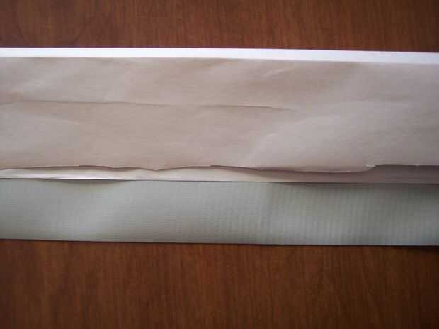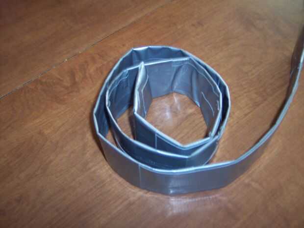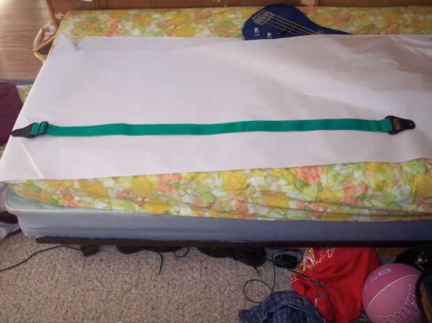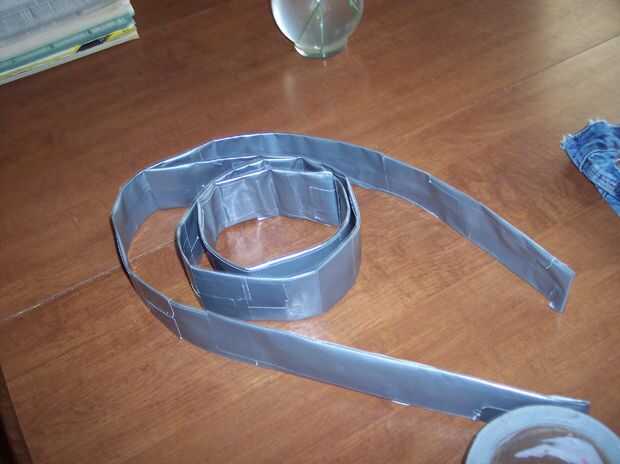 Comenzó tomando mi correa actual y corte una sección de papel que la longitud, pero hizo 4 pulgadas de ancho. Fue 44 pulgadas de largo. Luego dobla el papel por la mitad y comenzó a cubrir con cinta adhesiva. Y más de la cinta. Y más hasta que había cubierto completamente. Luego corté una franja de papel de 40 pulgadas y 3 pulgadas de ancho. Que esta había volteado por la mitad y había cubierto de cinta adhesiva. Lo que hice 2 correas era para que yo podría hacer ajustable.