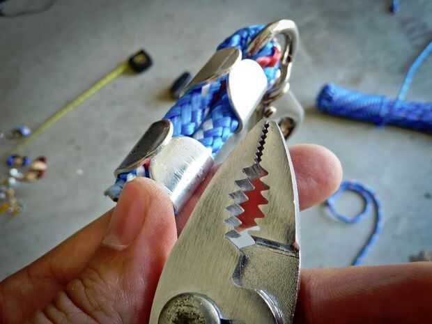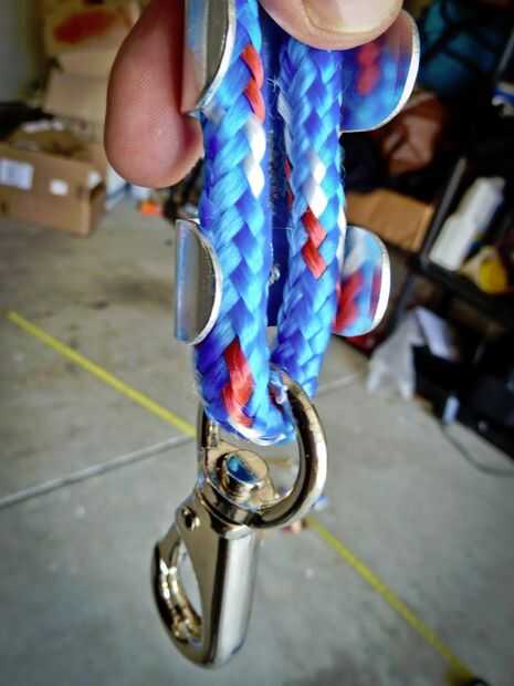 En un extremo de una de sus cuerdas, pasar la cuerda por el orificio de la abrazadera del eslabón giratorio y dóblalo para que quede en la pinza como en la primera foto. No deje demasiado del extremo de la cuerda más allá de la abrazadera antes de empezar a exprimir.
