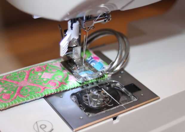 .. .y doblar el extremo de la correa hacia atrás y coser el doblez cerrado. Puede que use un prensatelas aquí si tus anillos D conseguir de la manera (tenía suficiente espacio y era capaz de usar el pie regular). Si no tienes un pie para cremalleras puede coser a mano también.