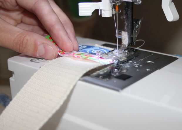 .. .it es más fácil poner cada cinta en uno a la vez (uno después del otro) como usted cose el lado de la cinta de algodón (aproximadamente 1/8" del borde de la correa). Sólo asegúrese de dejar la aguja hacia abajo cuando usted Levante el pie hasta el lugar al lado de la cinta así que nada cambia. Deje de una vez 6 o 7 pulgadas de cintas añadidos (me refiero a éstos como sus cintas "cortos"). Este 6 y 7 pulgadas de longitud y es sobre todo lo que es manejable para tejer una sola vez.