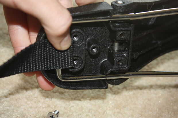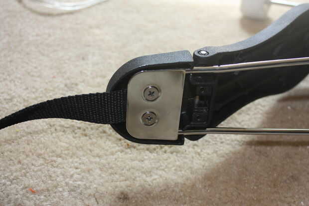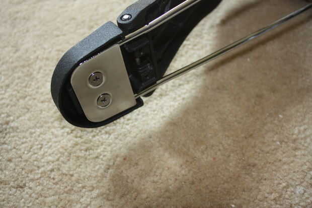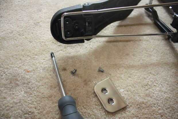 A partir de un pedal, quite la placa metálica en el extremo del talón, teniendo cuidado de no tira ningún tornillo. Lo que hice en el segundo pedal y tuve que ir a través de la diversión tarea de perforación hacia fuera y la búsqueda de un reemplazo adecuado.