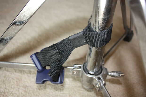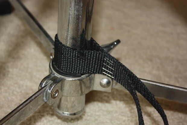 Con el nylon restante para fleje plástico punto de alrededor de un lugar en tu asiento de tambor que desea ser el ancla. Utiliza grapas para sujetarlo alrededor del polo (por lo que no se deslice hacia atrás y de cuarto) que obviamente no es una solución muy permanente, pero todavía están sosteniendo.