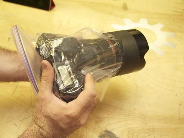 Esta debajo de la caja de agua para una cámara réflex digital está hecha de una caja de estancas de Wal-Mart y piezas de plomería de Home Depot.  En total creo que el costo de "profundizar" (bien 6' o algo así) era menos de $40,00 y las fotos so